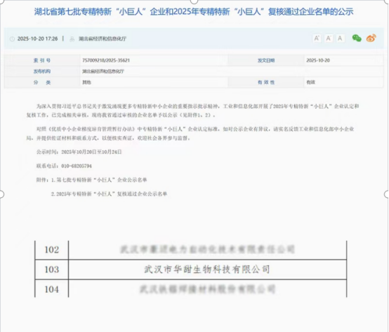 2025年10月20日,湖北省经济和信息化厅公布《湖北省第七批专精特新“小巨人”企业和2025年专精特新“小巨人”复核通过企业名单》,武汉华甜公司位列其中,标志着公司顺利通过国家级专精特新“小巨人”企业复审。